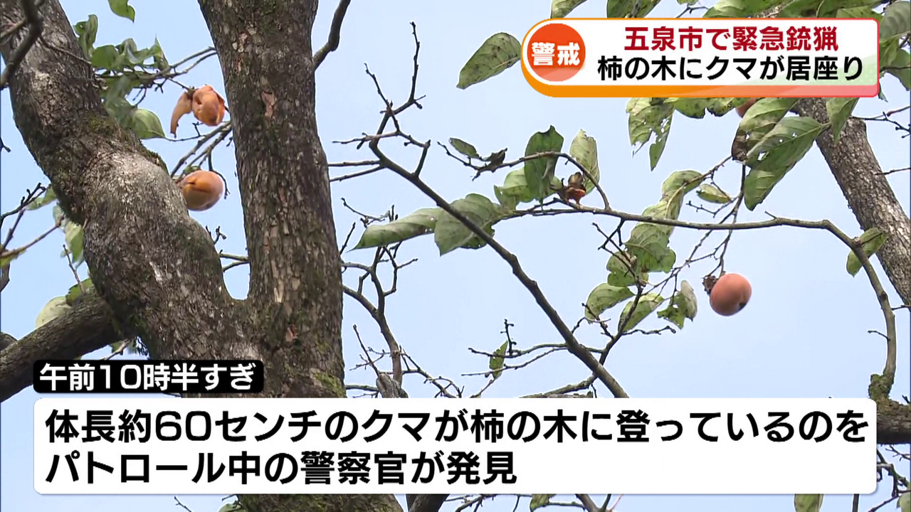 13日午前10時半過ぎ、体長約60センチのクマ1頭が柿の木に登っているのをパトロール中の警察官が発見しました。