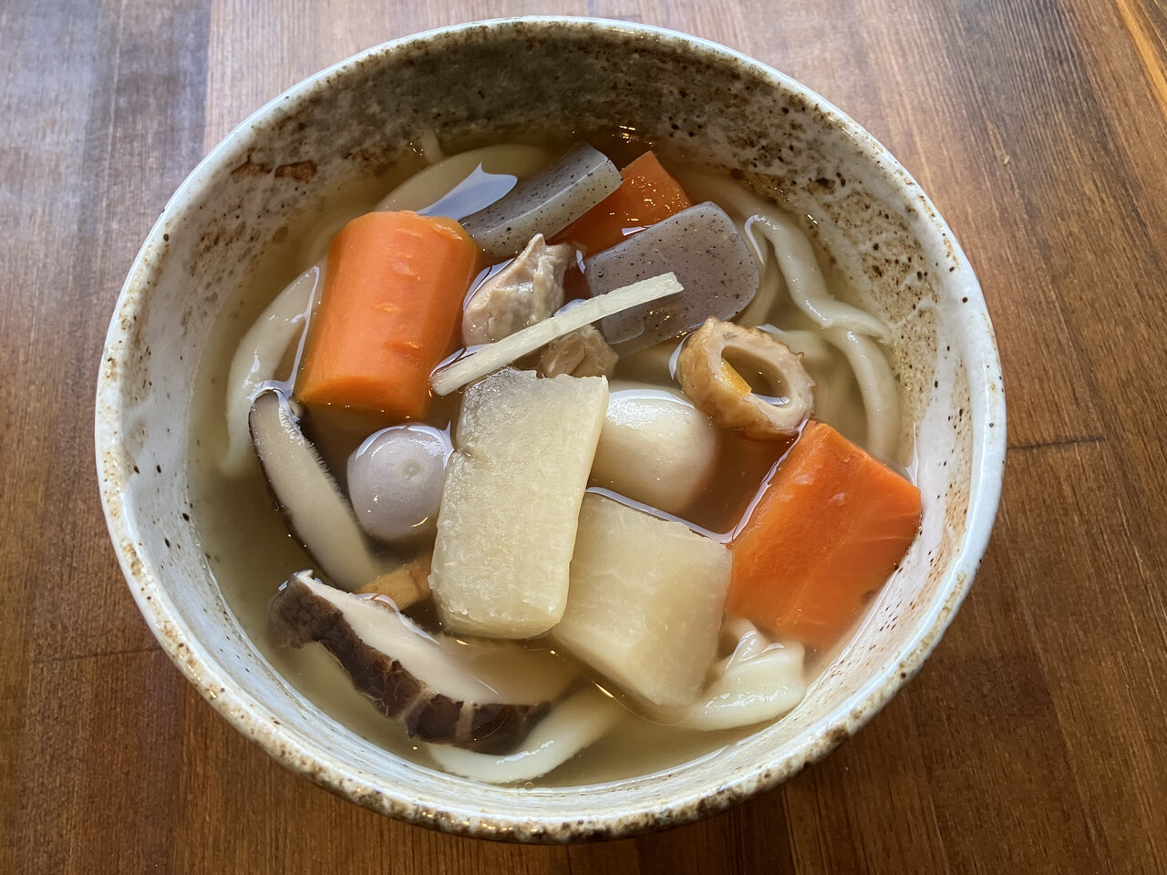 人参や大根、里芋にしいたけなど、大きめにカットされた食材がゴロゴロ!温かい麺は、少し柔らかく、ふんわり。