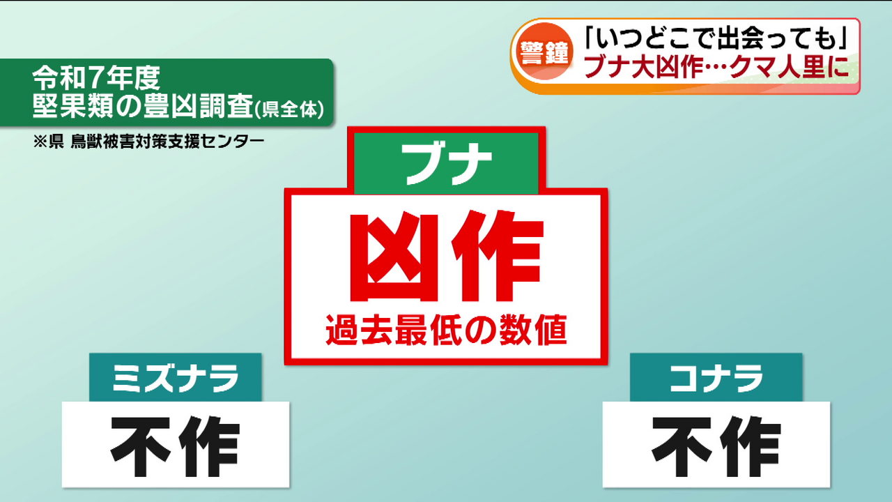 「ことし実は過去最悪の数値。ブナが実らないと人里だとか市街地まで多くのクマが出没をするようになる。人里にエサがあるということを学習するクマがどんどんどんどん増えていく」