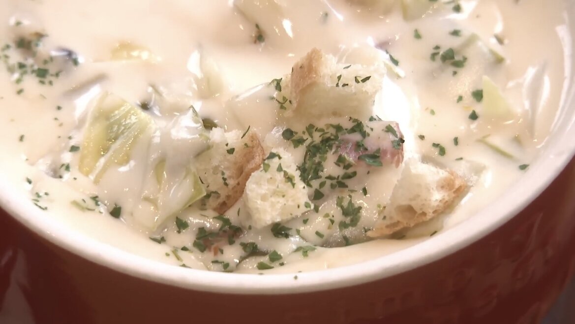 じゃがいも、玉ねぎ、キャベツ、ベーコン、アサリなどがたっぷりゴロゴロ入っていますよ!