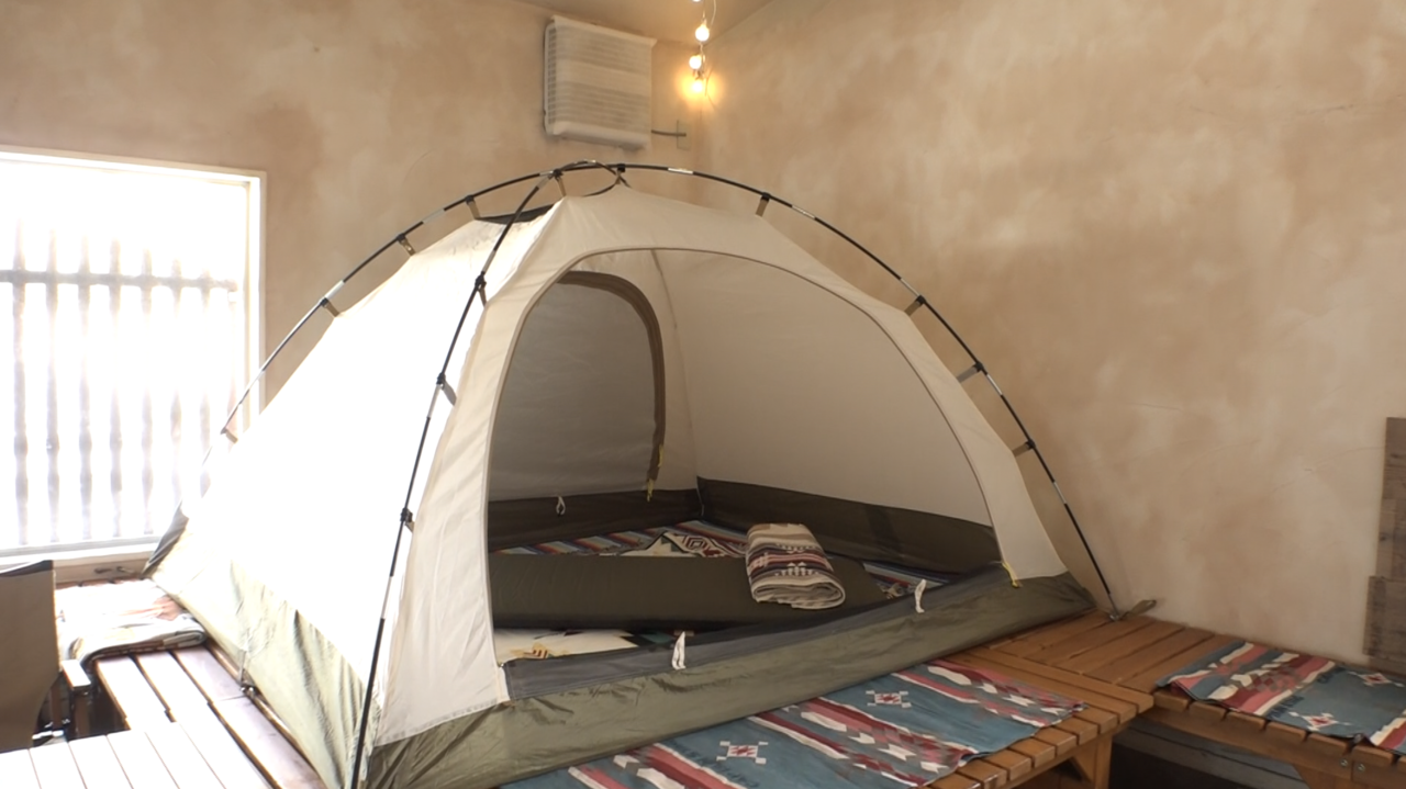 店内にはキャンプで使うテーブルやイス、マグカップが揃っているだけでなく、丸ごとテントが立てられているんです!