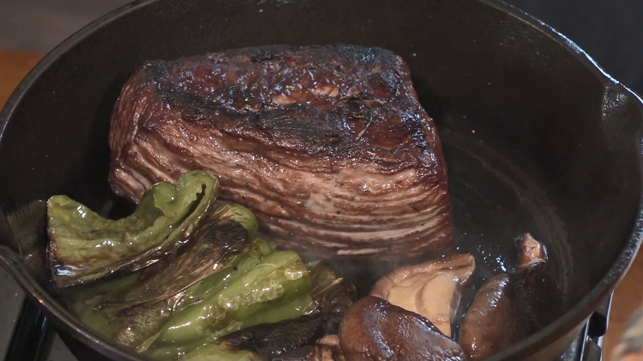 塊のままじっくりと焼いた黒毛和牛は脂が甘く、肉肉しい食感がたまりません。