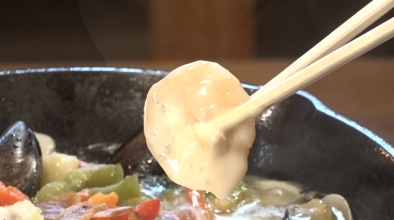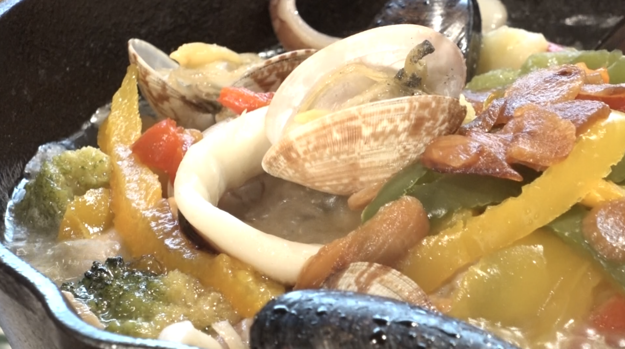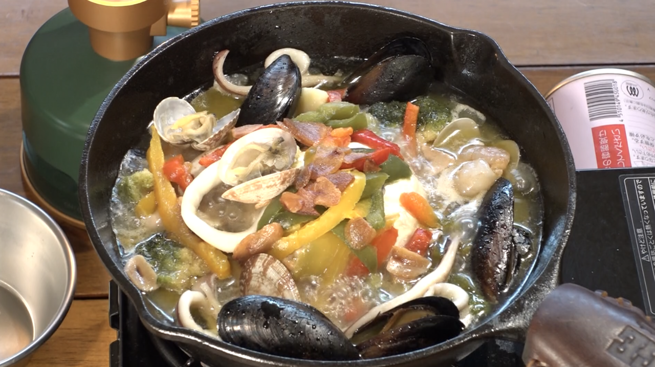 キャンプ飯の定番、海鮮がたっぷりと入った「海鮮アヒージョ」もおすすめです。