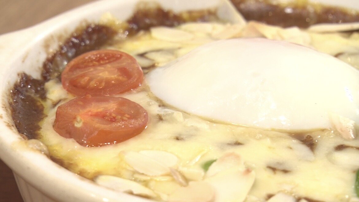 23種ものスパイスが使用されたカレーにたっぷりのチーズ、温泉卵を乗せてオーブンで焼かれたこちらのメニュー。