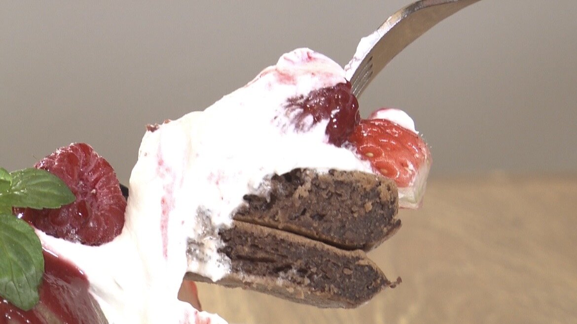 カカオパウダーを生地に練り込んだパンケーキに、静岡県産いちご“あきひめ”などをトッピングした一品です♪
