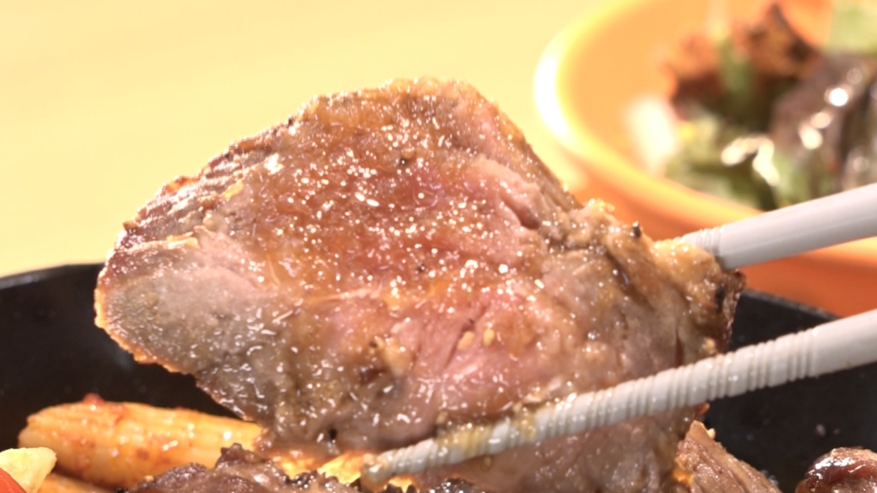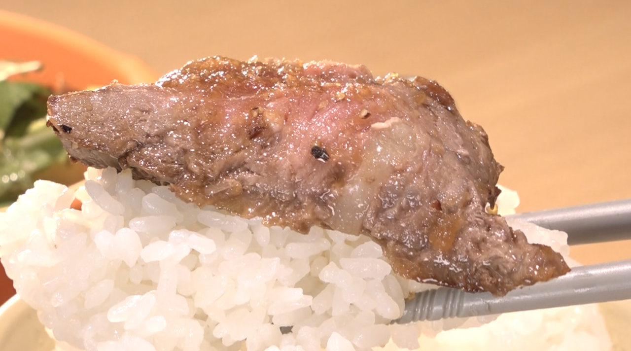 かみごたえ抜群のステーキから肉汁が溢れ出します。しっかりと味付けされたお肉はご飯が進みますよ!