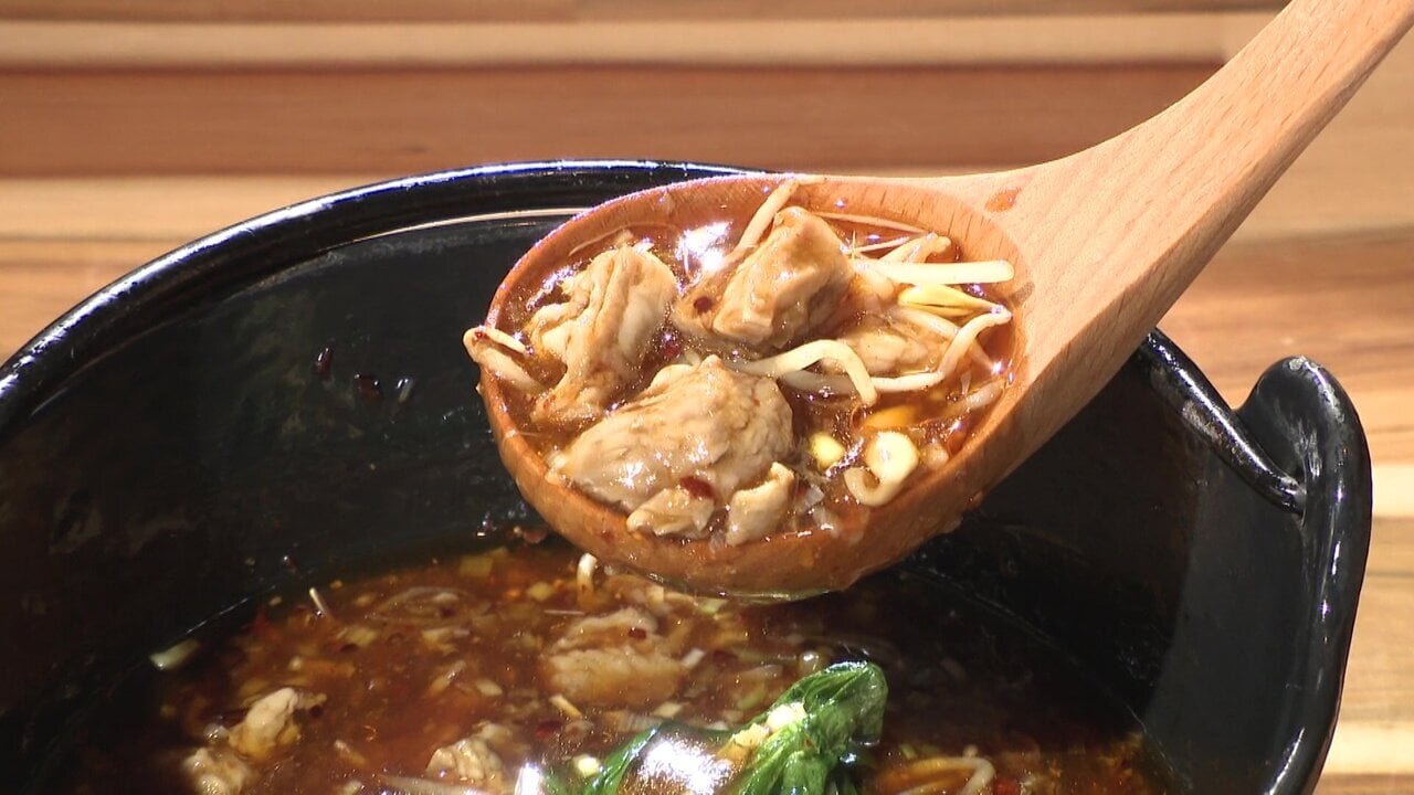 とろみのある煮込みに、ネギがたっぷり。湯気とともに立ち上るのは、鼻がツンとするしびれるような辛い香り。ひと口目からガツンとした辛味が広がります。