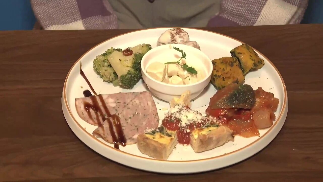 カポナータやホウレンソウのキッシュ、イタリアンソーセージなど、多彩な前菜を一度に楽しめる一皿です。