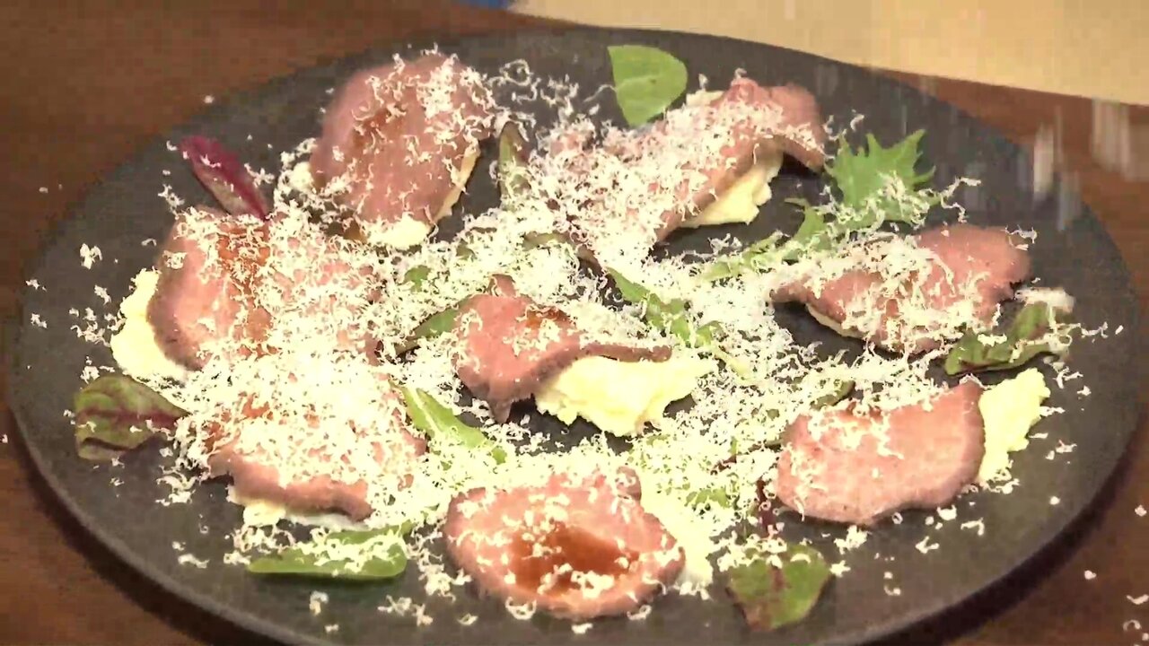 薄切りにした牛タンのローストビーフに、マッシュポテトを添えた一皿。トリュフ香る醤油ソースと、削りたての“グラナ・パダーノチーズ”をたっぷりとかけて贅沢に仕上げています。