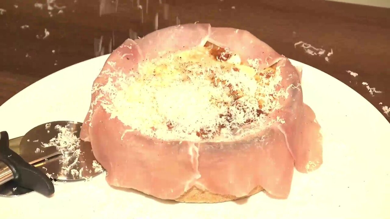 お店で一番人気の「生ハム温玉シカゴピザ」!たっぷりのチーズがかかったボリューム満点の一品です。