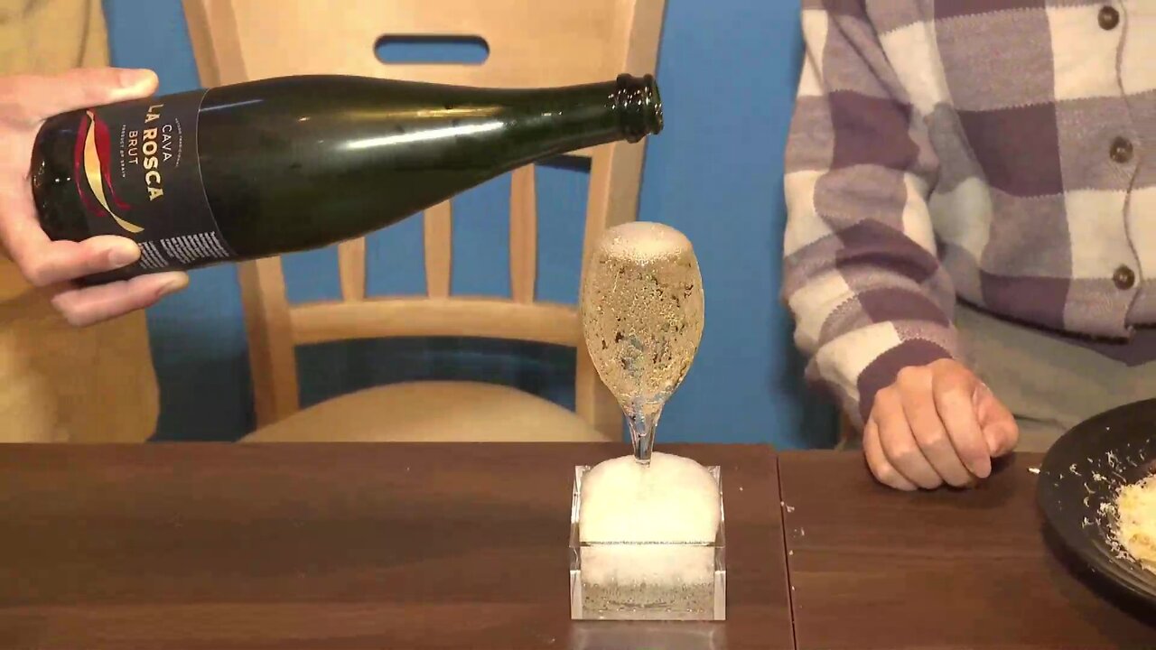 チーズ料理のお供におすすめのスパークリングワイン。グラスからこぼれるまで、なみなみと注いでくれます!辛口で、さまざまな料理と相性がいいんですよ。