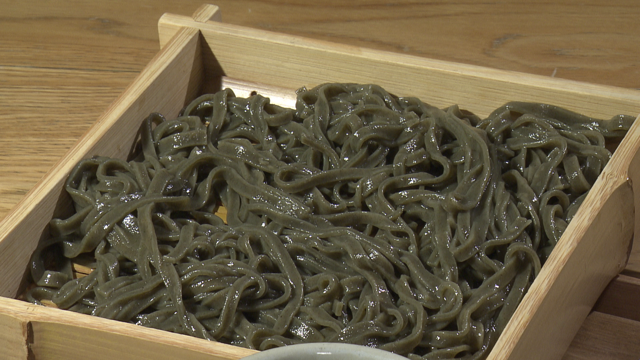 佐渡の海藻のナガモを麺に練りこんだ、平細の黒いうどんが特徴的!