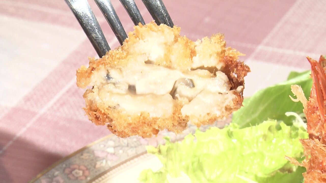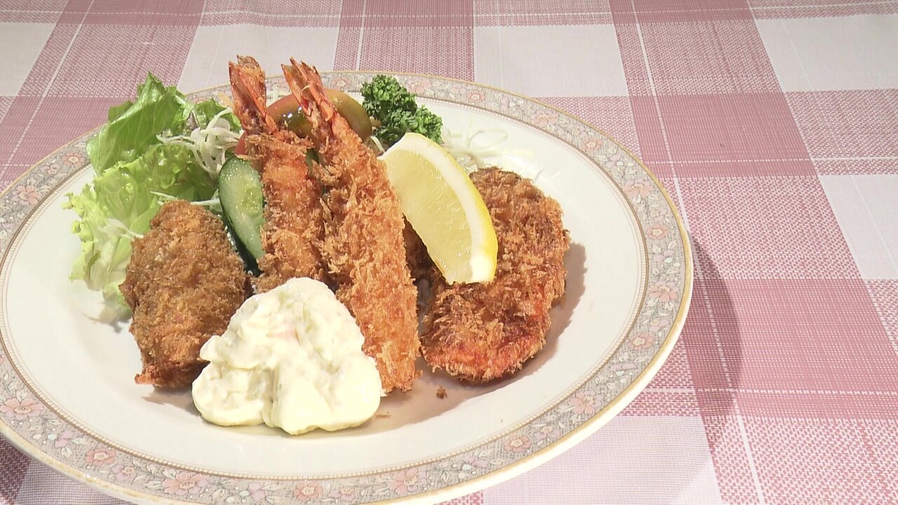 「ミックスフライ」はカキ・エビ・ホタテ・サーモンの4種が楽しめます。生パン粉でサクサク、香ばしく仕上げています。