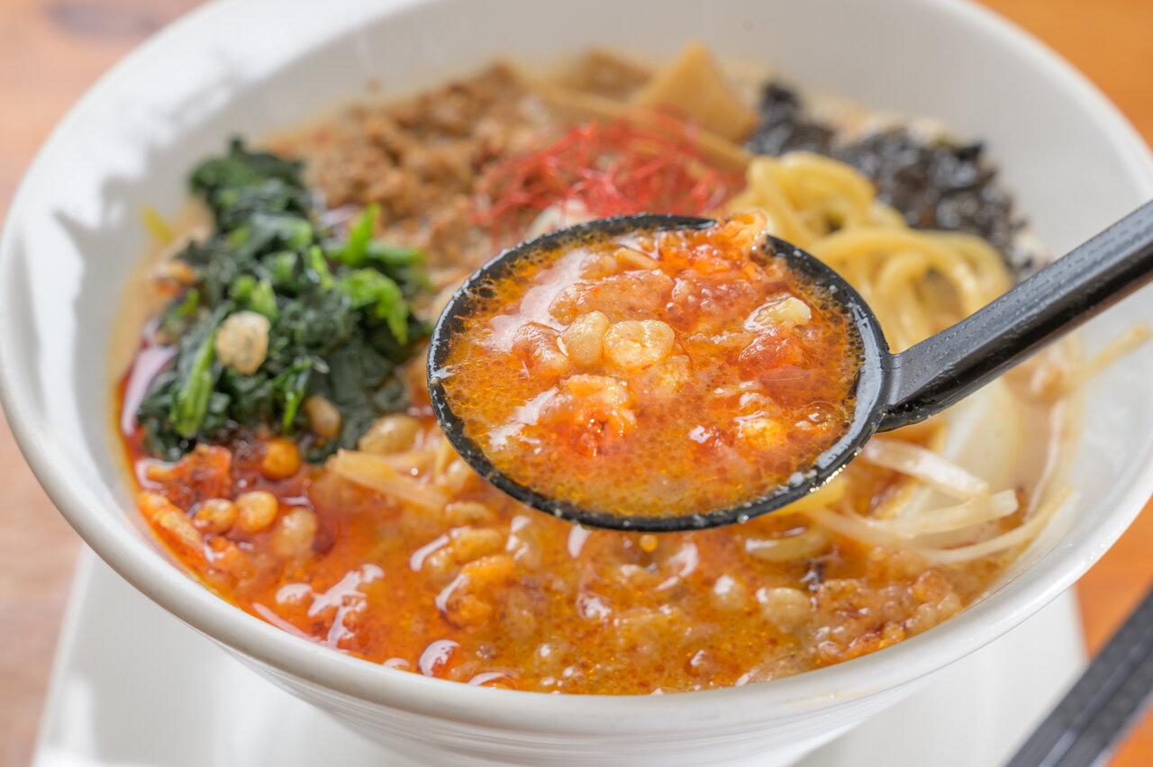 担々麺には岩のりも入っており、海老とゴマに加えて、磯の香りがアクセントに。
