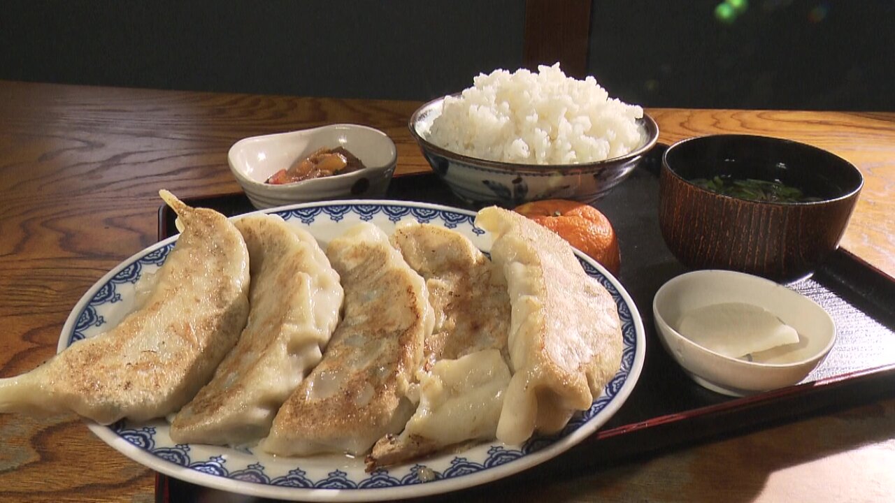 こちらは名物のジャンボ「ギョーザ定食」。長さ約15cmもあるビッグサイズで、ひと目で伝わる迫力が評判の一品です。