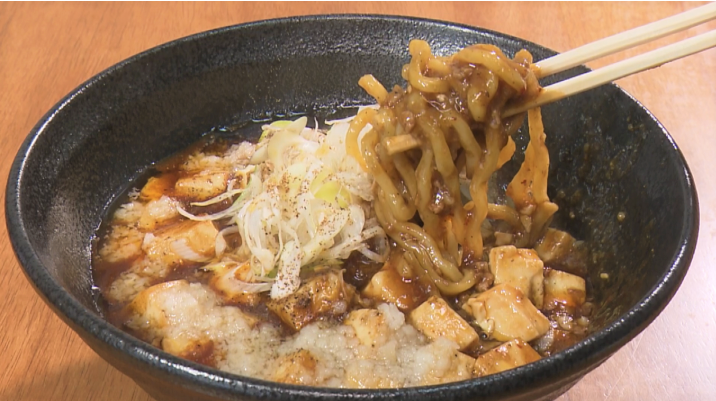 ラー油や山椒などの香辛料が効いた本格的な麻婆豆腐を背脂で包み込む「背脂麻婆麺」。