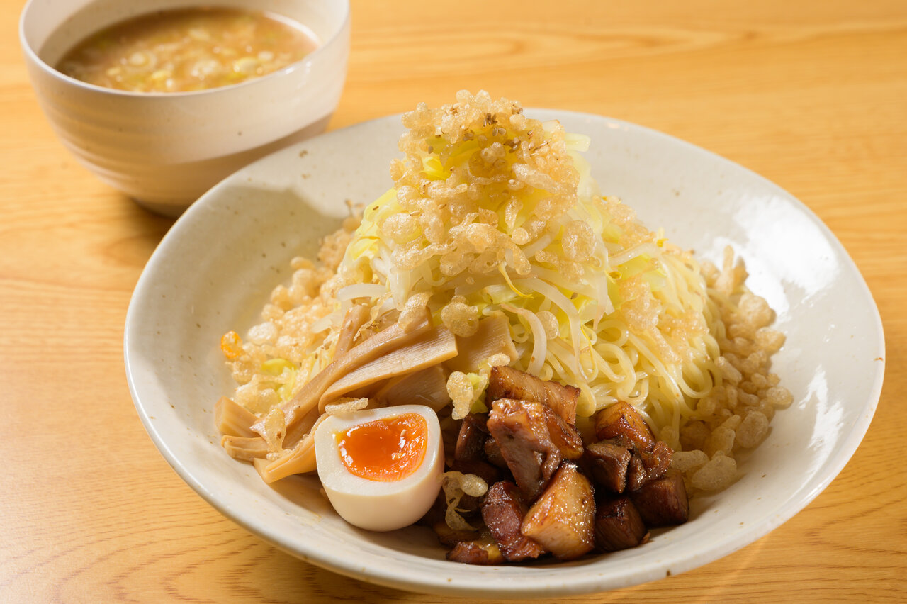 「秋葉区産もち麦の揚げ玉かけ 南蛮えびだし肉つけ麺」(1,300円)