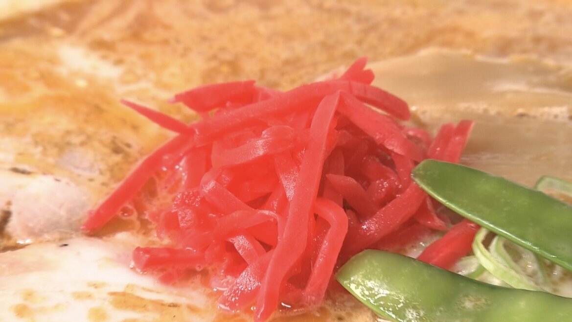 センターを飾る紅しょうがは、濃厚な豚骨の効いたかえしのスープを支えています!