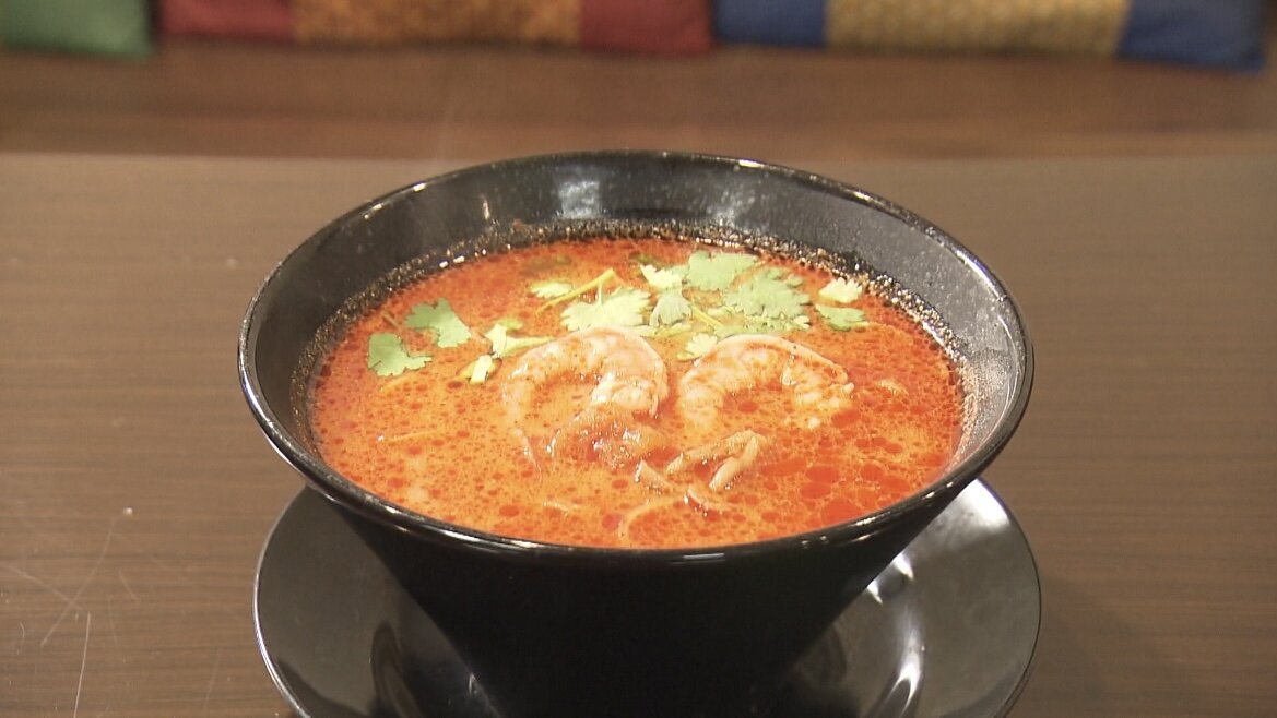 真っ赤なスープに主役のエビ、そして色鮮やかなパクチーが特徴です。