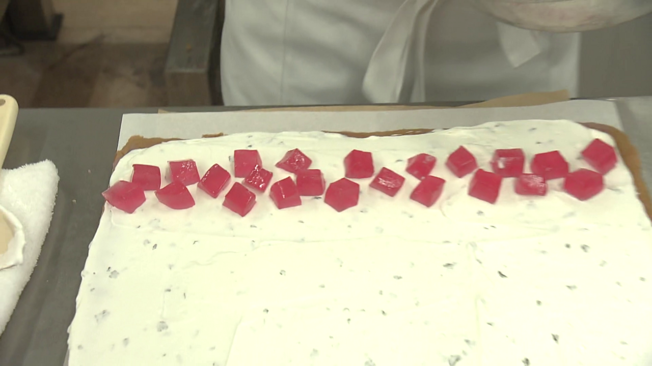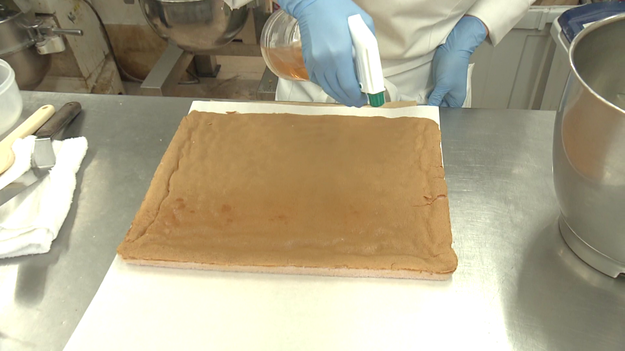 その上には、塩漬けされた桜の葉を混ぜたあんと生クリームが塗られ、桜のエキスが入ったわらび餅が乗せられます!