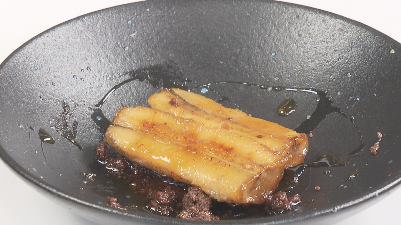 2品目は「バナナのキャラメルソテー」です。ほろ苦いキャラメルソースがバナナの甘さを引き立てる一皿です♪