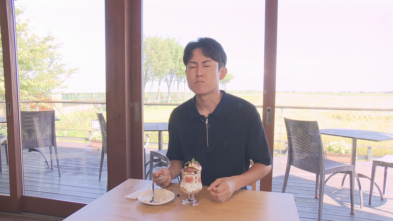 「プチプチとした食感が楽しく、トロっとした甘さに生クリームの優しい味わいが絶妙にマッチしていて美味しいです」と、この表情です。