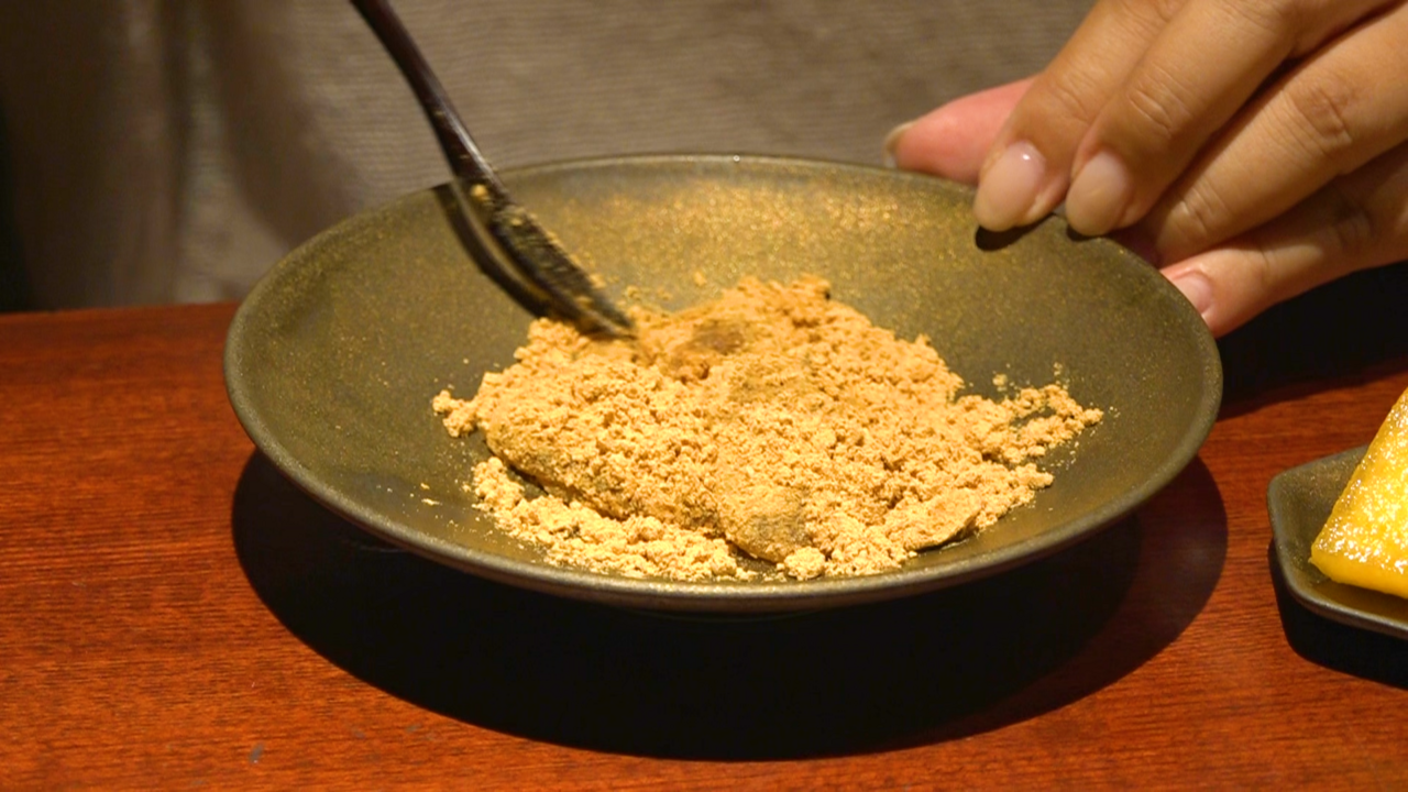 つきたてのわらび餅に、きな粉がたっぷりとかけられています。