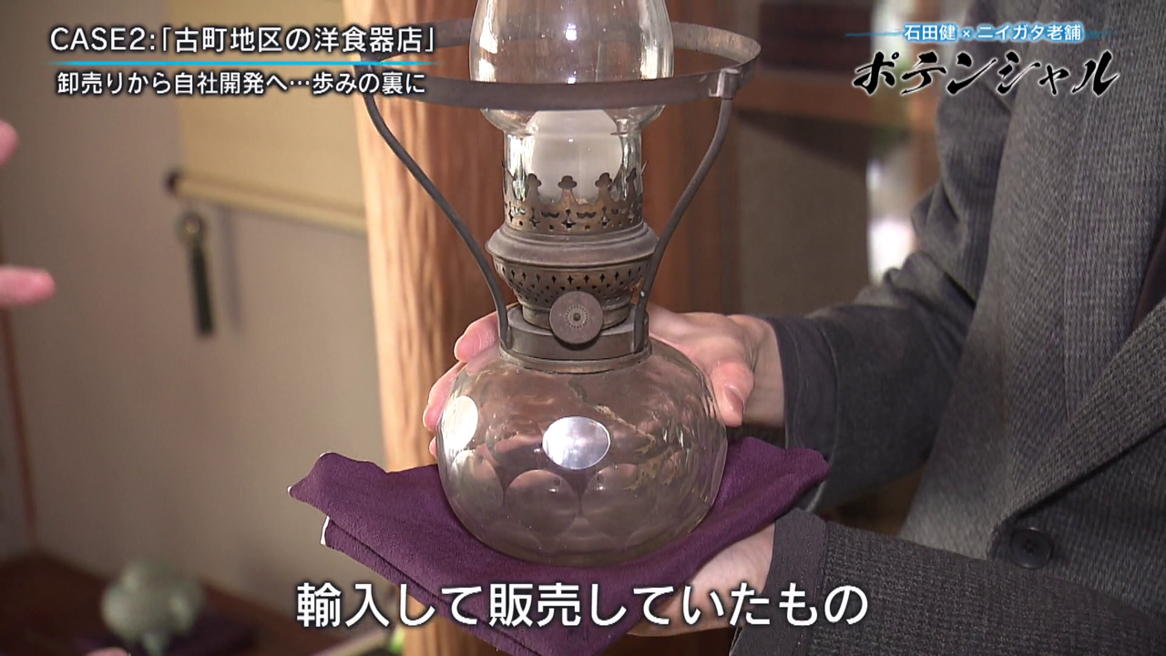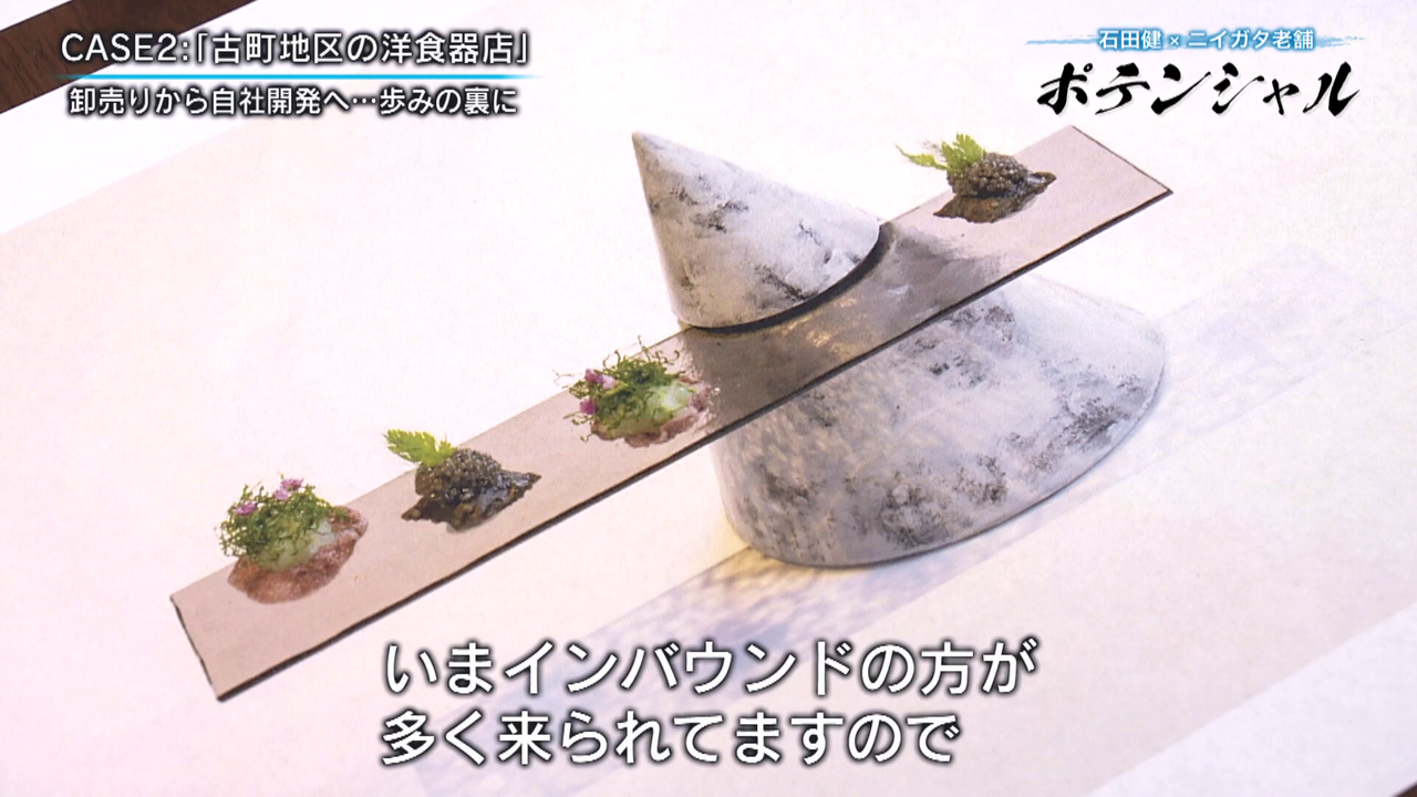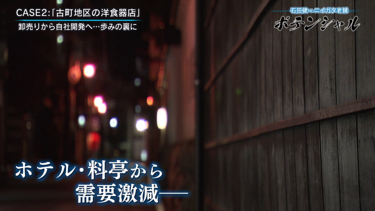 「こんにちは石田健です。今回は古町に来ています。趣ある石畳に歴史を感じさせる建物が並んでいますが、今回密着するのは老舗の洋食器店です。この地で140年近くにわたり店を構え、独創的な食器を生み出しています。老舗に宿るポテンシャルとは」