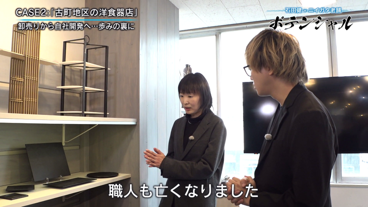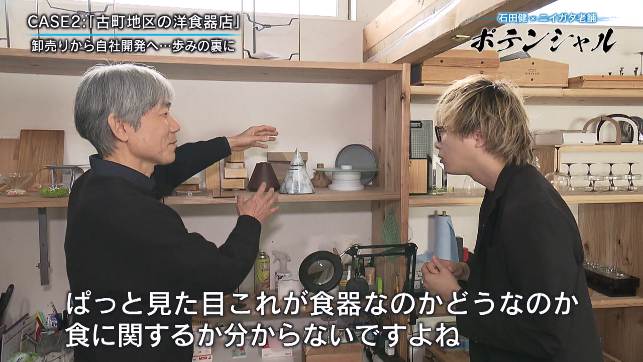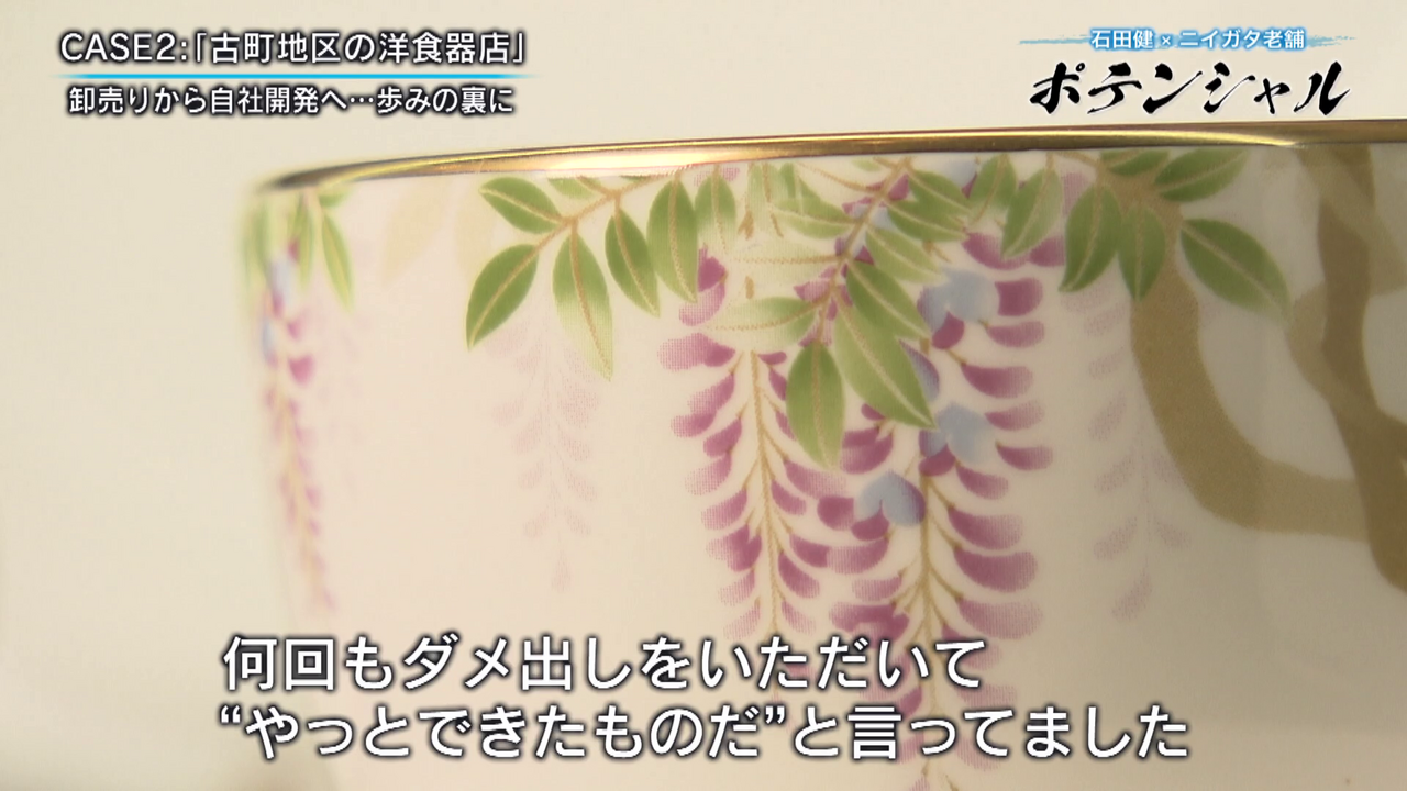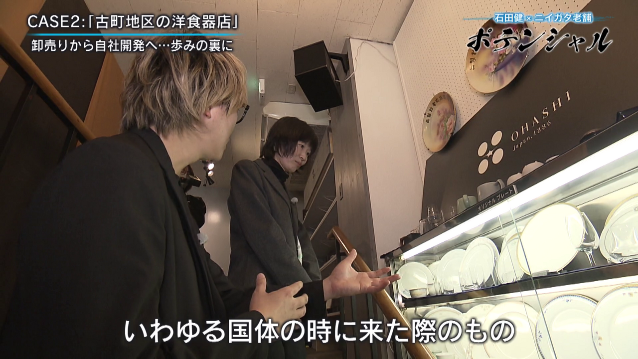 「こんにちは石田健です。今回は古町に来ています。趣ある石畳に歴史を感じさせる建物が並んでいますが、今回密着するのは老舗の洋食器店です。この地で140年近くにわたり店を構え、独創的な食器を生み出しています。老舗に宿るポテンシャルとは」
