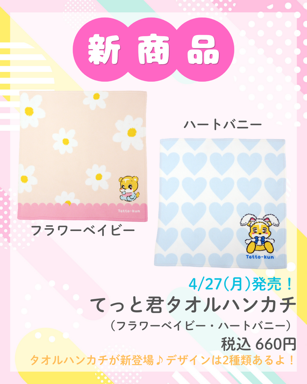 てっと君タオルハンカチ(フラワーベイビー・ハートバニー)/各660円