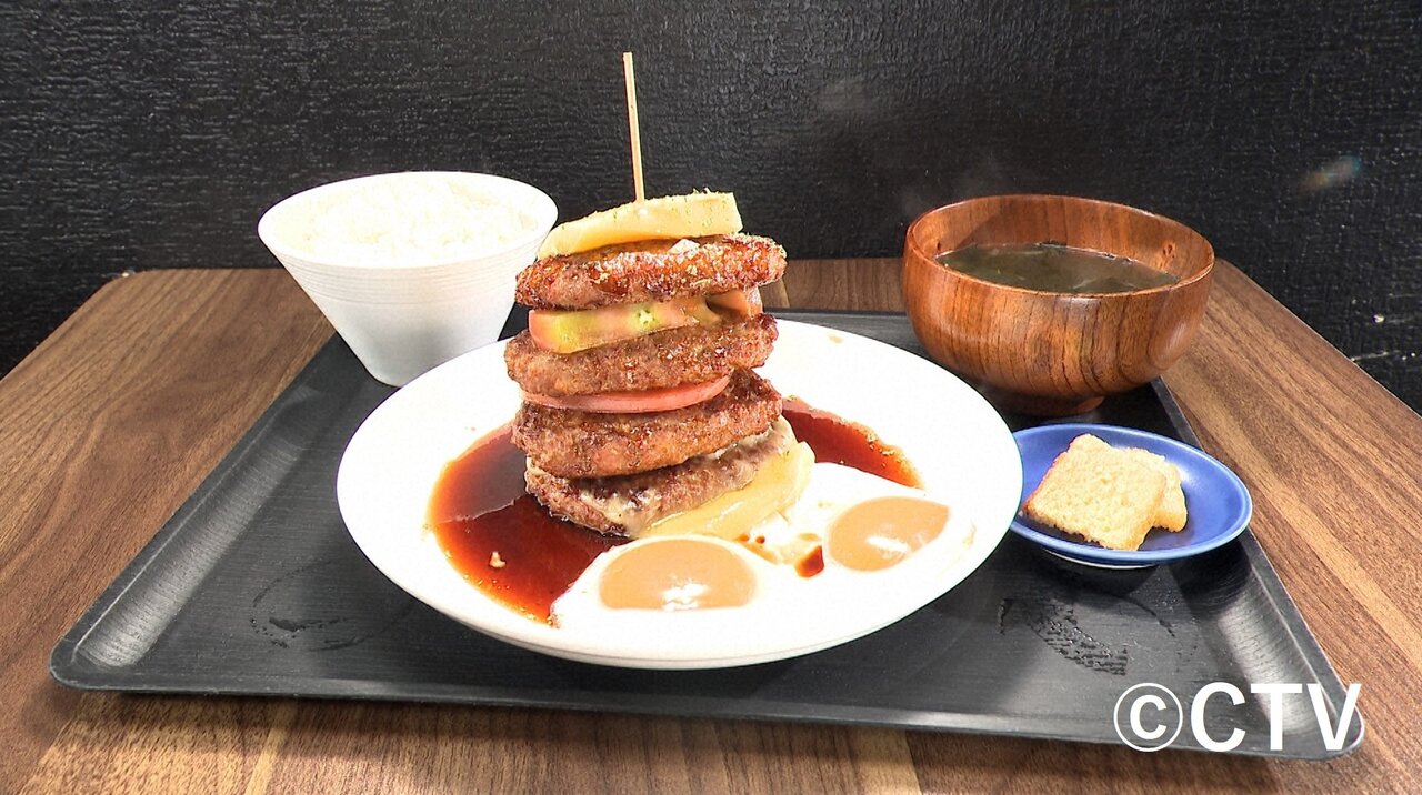 ある日の日替わりは、“4タワーハンバーグ”(1,300円)で、牛・豚の合いびきハンバーグをチーズやトマト、目玉焼きを挟んでタワーにしたもの。またある日は、黒毛和牛の希少部位・みすじを使った“おまかせ牛焼き定食”(1,000円)、さらに別の日は“金目鯛の1匹煮定食”(900円)と、ジャンルに縛られない定食を、ごはんのおかわり無料で提供している。
