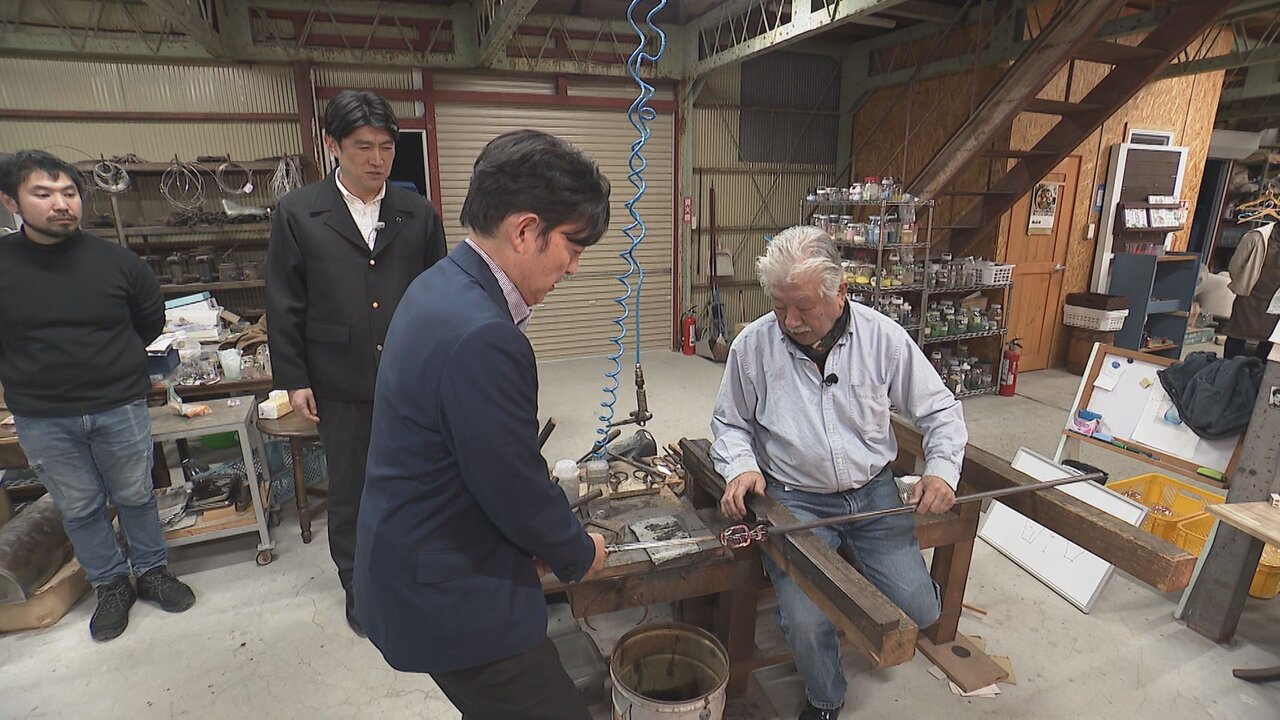 現在も残る唯一のガラス工房「秋葉硝子」を訪ねたふたりは、オリジナルのおちょこ作りに挑戦!