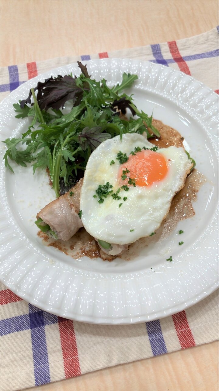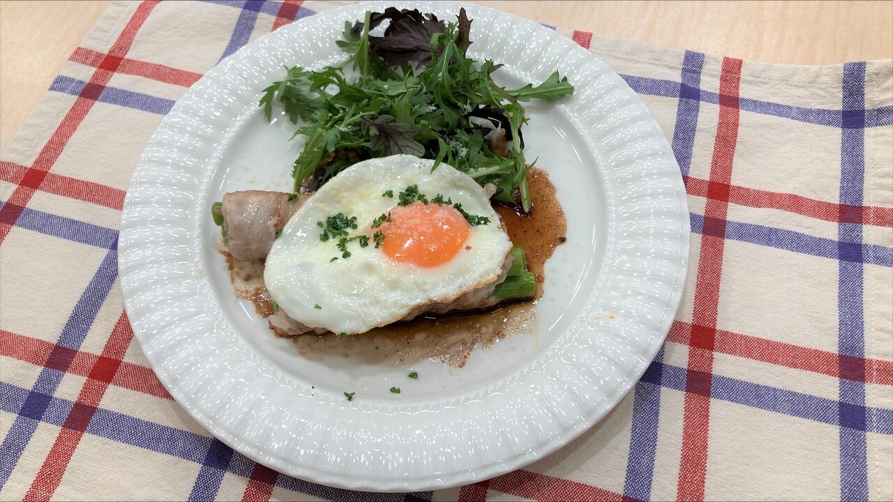 「アスパラの肉巻き 目玉焼きのせ」について