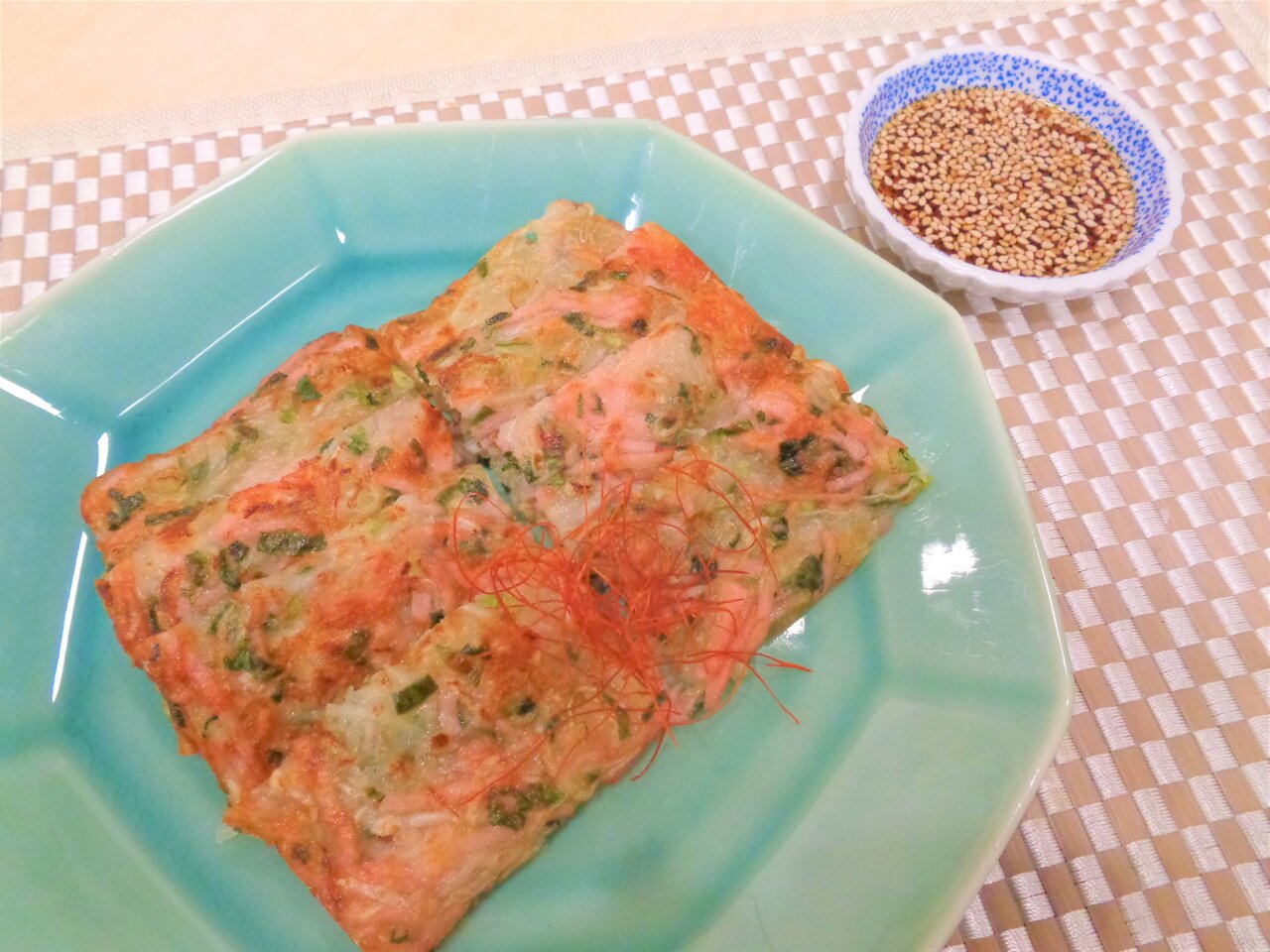 5.ポン酢、白ごまを合わせたタレを添える。糸唐辛子添える。