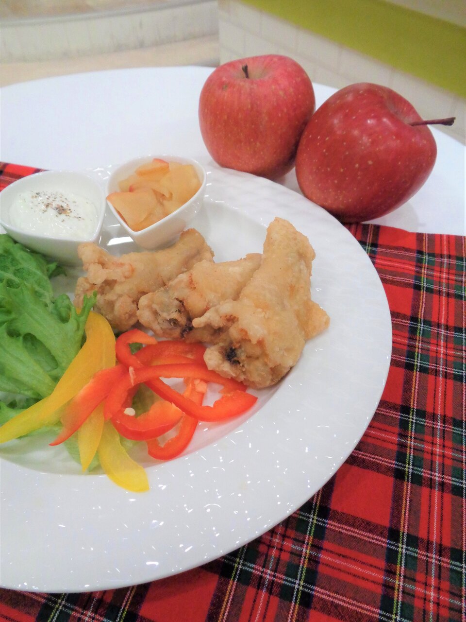 そのままレモンを絞るだけでも美味しいですが、クリスマスらしくりんごのソースを添えて華やかに!