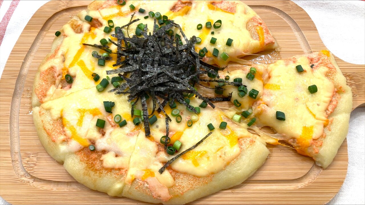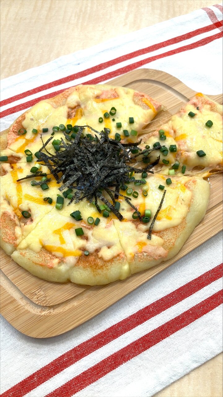 じゃがいも×白玉粉で作るピザ生地に、タラコマヨのコクとうま味を合わせた一品です。