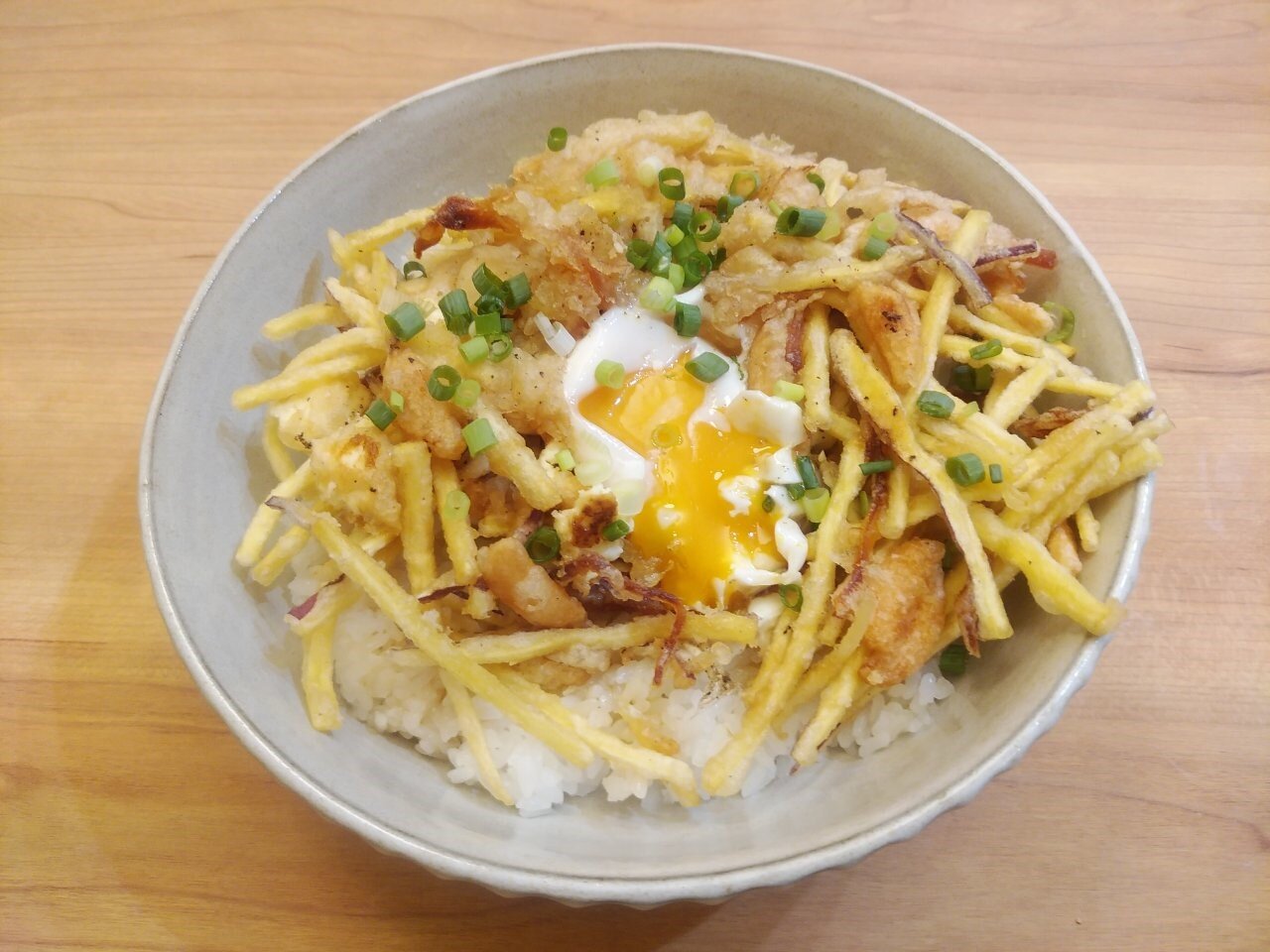 旬のさつまいもを使って鳥の巣に見立てたかきあげ丼です 。