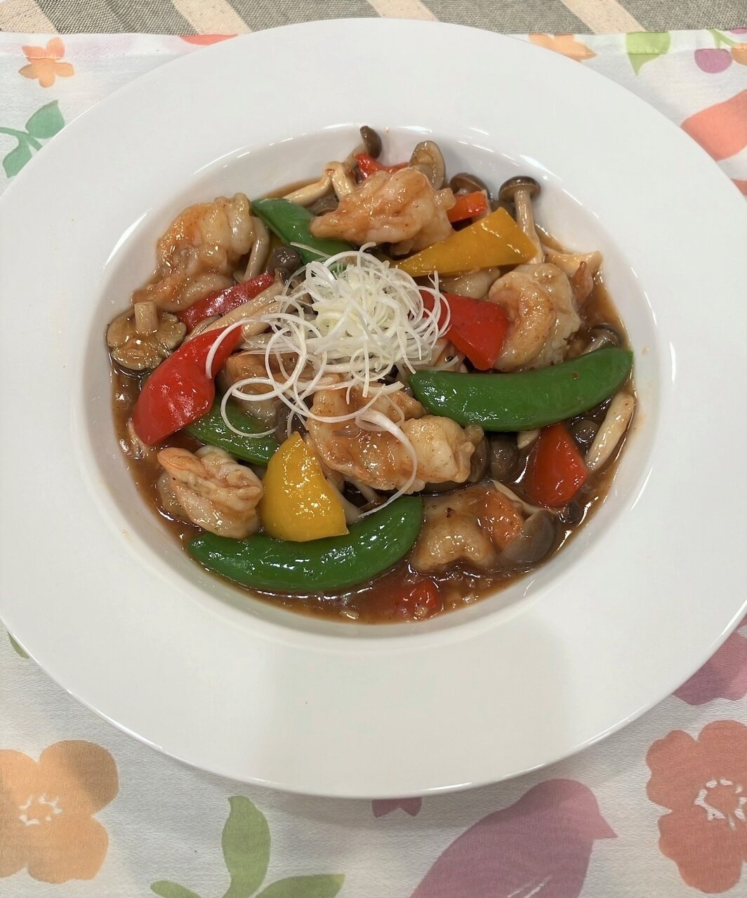 海老のぷりぷり食感と、スナップエンドウのシャキリとした歯ざわりを楽しむ香り豊かな炒め物ですよ。