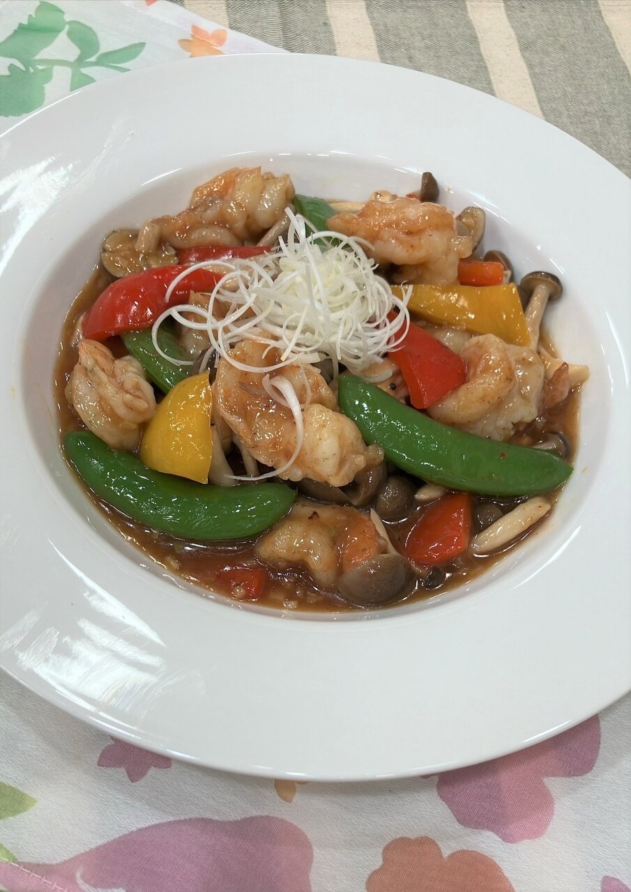 3.フライパンにサラダ油を入れ、しょうがとネギのあらみじん切りを炒め、 パプリカ、しめじ、海老を入れる。海老の色が変わってきたらAを加え混ぜながら温める。最後にスナップエンドウを加える。