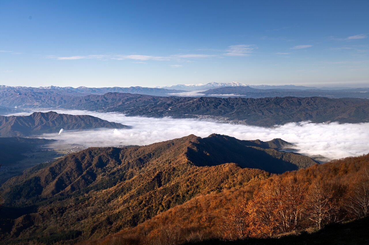 ロープウェイに乗って山頂へ向かう途中、魚沼平野や谷川連峰、巻機連峰、大峰山などが一望でき、まるで絵画のような美しい景色が広がります。