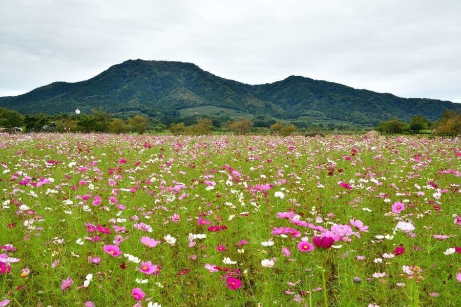 秋には山を背景に、季節の花であるコスモスが咲き誇る姿を堪能することができます。