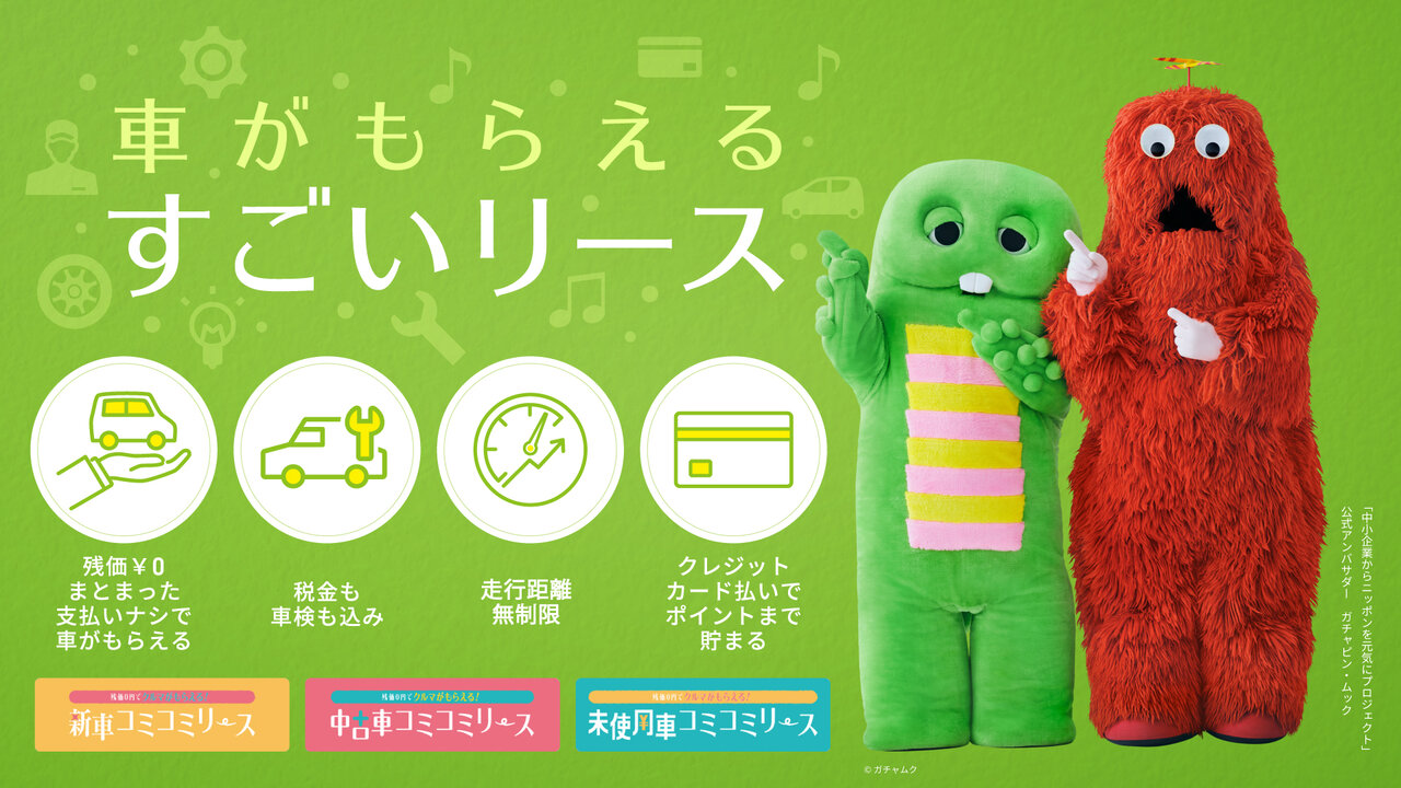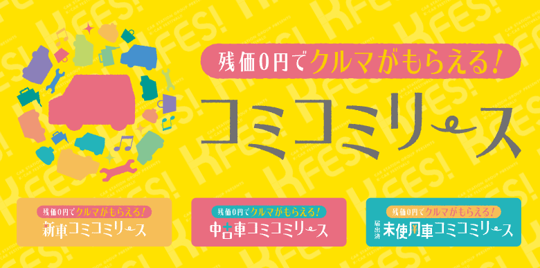 CMでもおなじみの「コミコミリース」なら、月々1万円台から新車・中古車・未使用車に乗れて、リース満期にはクルマがもらえるプランも選べます。
