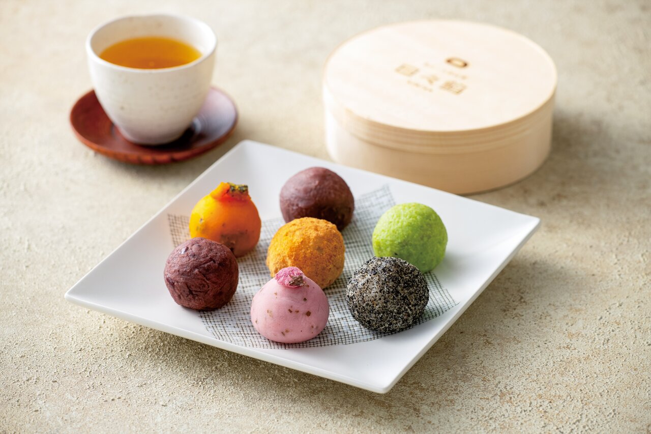 可愛らしいミニおはぎセットは、曲げわっぱの中に七つの福がいっぱいに詰まったカラフルな組み合わせで、いろんな味を食べてみたいという方にオススメです。