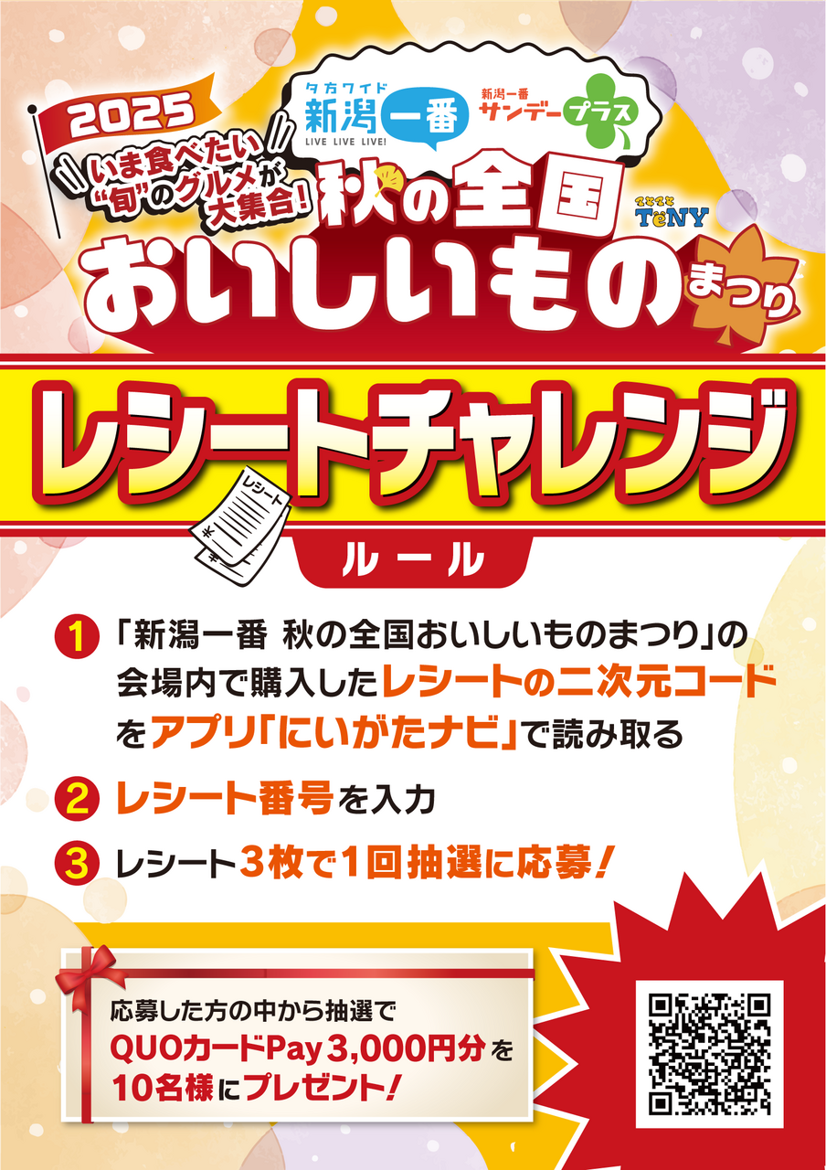 さらに、「新潟一番 秋の全国おいしいものまつり」の会場で3店舗以上買いまわって、TeNYのアプリ「にいがたナビ」で応募すると抽選で「QUOカードPay3,000円分」が当たるキャンペーンを開催!
