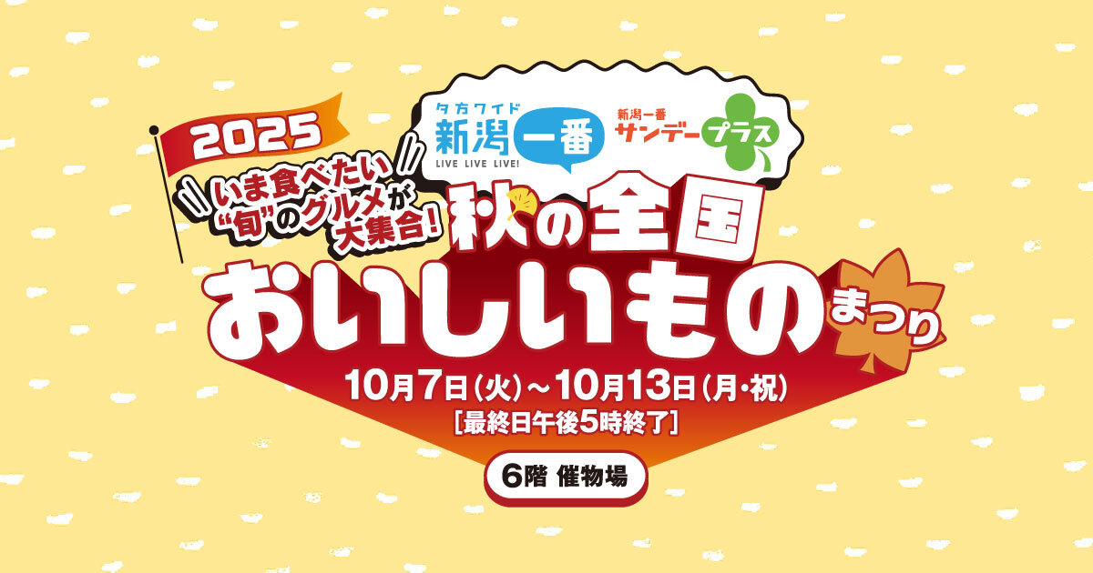 10月7日(火)から開催される「新潟一番 秋の全国おいしいものまつり」。旬の味覚を食べ比べたり、おみやげを選んだり、会場にいるだけでワクワクが止まりません!いま食べたい全国各地の“旬”のグルメが勢揃いするイベントで、この秋あなたの推しグルメを見つけちゃいましょう♪