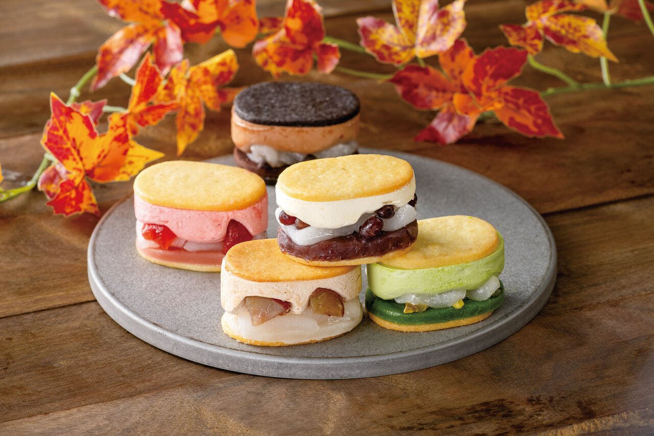 羽二重餅のモチモチ食感に、空気たっぷりのふわふわバタークリーム、各種フレーバーの食材や餡子をチーズクッキーでサンドした一品です!