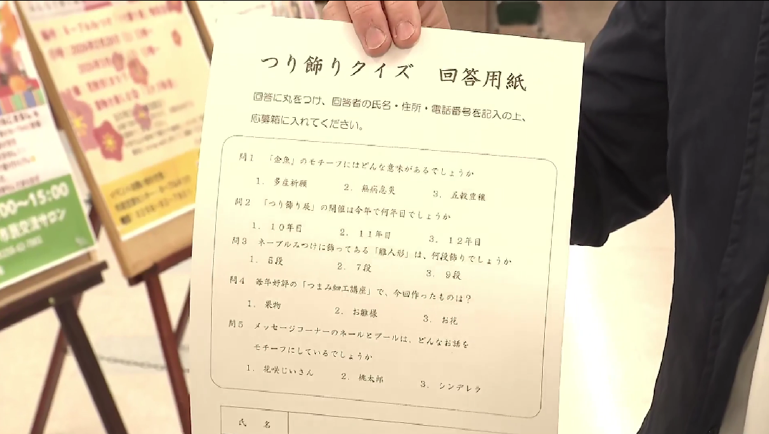 こちらの「つり飾りクイズ」は、正解すると手作りのつり飾り作品が抽選でもらえるんです!
