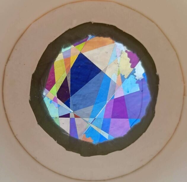 偏光板にセロハンテープを貼り、穴の開いた紙コップに取り付けることで、カラフルな模様が現れる万華鏡を作ることができます。紙コップに絵を描くなどして、参加者が好きなようにデザインすることも可能です。