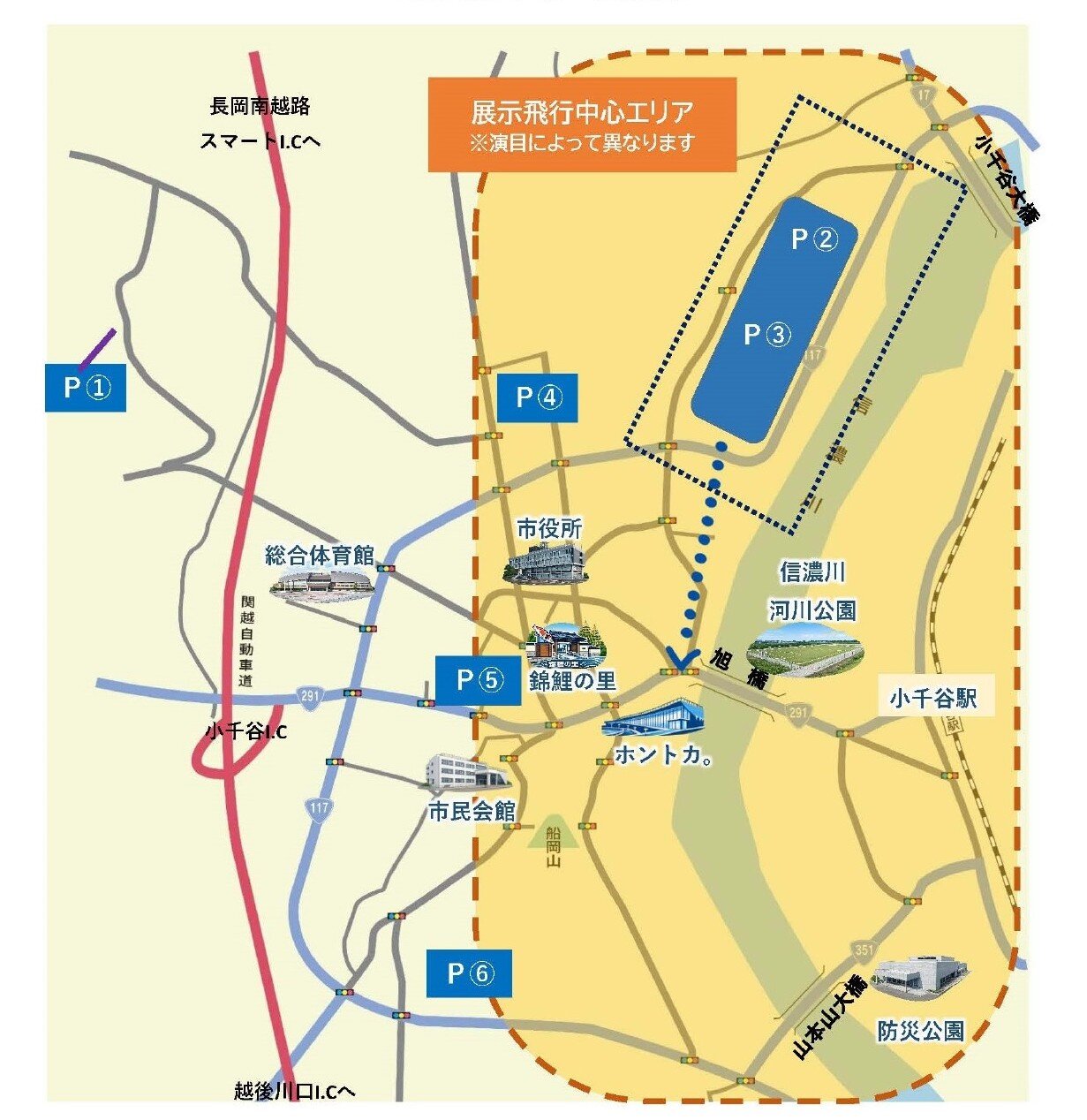 ブルーインパルスの展示飛行は、中心市街地の信濃川沿いを中心とした半径1km程度の範囲で行われる予定です!