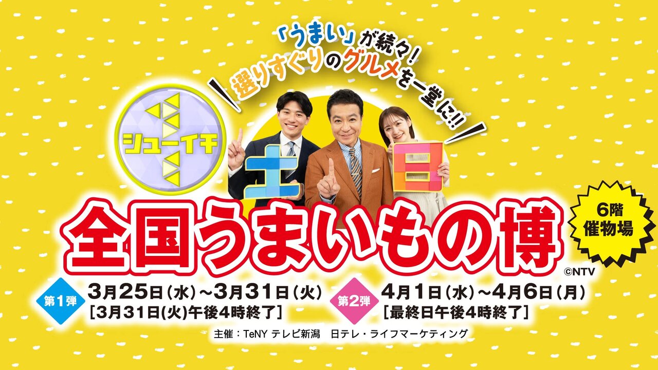 2026年3月25日(水)から開催される「シューイチ全国うまいもの博」。第1弾・第2弾の前後半に分けて合計13日間開催!毎週土日の朝、TeNYで放送中の「シューイチ」で紹介された話題のグルメや、全国の人気店など各地の"うまいもの"が新潟に大集合!あなたのイチオシグルメを見つけちゃいましょう♪